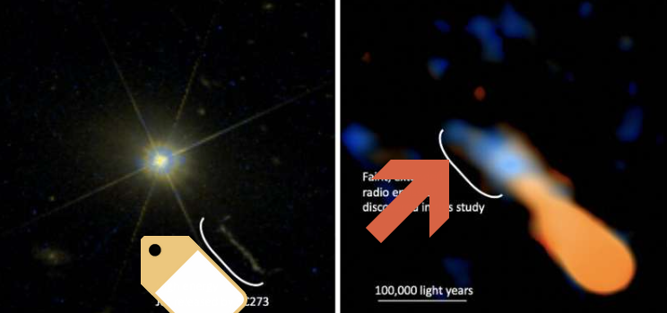 허블 우주망원경(HST)이 관측한 퀘이사 3 C273(왼쪽). 과도한 밝기는 망원경의 산란광에 의해 발생하는 방사형 빛의 누출을 초래한다. 오른쪽 아래에는 중심 블랙홀 주변의 가스에서 방출되는 고에너지 제트가 있다. | ALMA가 관측한 3C273의 전파 이미지이며, 원자핵(오른쪽) 주변의 희미한 확장된 전파 방출(청백색)을 보여준다. 밝은 중앙 소스가 이미지에서 제외되었습니다. 왼쪽 영상과 동일한 제트가 주황색으로 표시됩니다. 높은 영상역학 범위를 달성한 결과, 연구팀은 3C273의 주인 은하에서 수만 광년의 희미한 전파 방출을 발견했다. 퀘이사 주변의 전파 방출은 보통 항성을 형성하는 폭발이나 중심핵에서 방출되는 초고속 제트와 같은 고에너지 사건의 싱크로트론 방출을 시사한다. 싱크로트론 제트는 3 C273에도 있으며, 이미지의 오른쪽 하단 모서리에서 볼 수 있습니다. 싱크로트론 방출의 본질적인 특징은 주파수에 따라 밝기가 달라지는데, 연구팀이 발견한 희미한 전파 방출은 주파수와 상관없이 일정했다는 것이다. 대체 메커니즘을 검토한 후, 연구팀은 3C273 핵에 의해 직접적으로 전파가 전달된다는 것을 발견했는데, 이는 퀘이사 집합 하에서 이러한 메커니즘의 전파가 수만 광년 동안 연장된 최초의 사례이다. 천문학자들은 이 상징적인 우주 등대에서 수십 년 동안 이 현상을 간과해 왔다.
