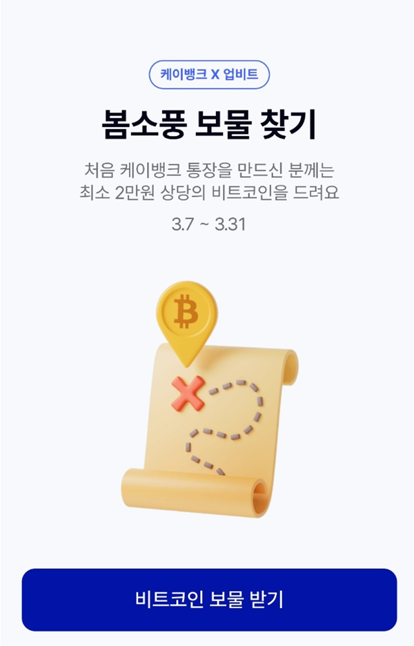 3월 31일까지 진행되는 이번 케이뱅크 보물지도 이벤트, 늦더라도 꼭 참여해보세요. 이미 많은 분들이 현금과 비트코인을 받아가고 있다는 사실, 알고 계셨나요?