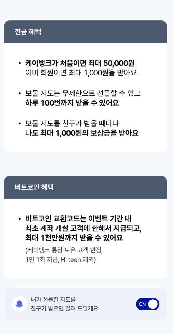 - 기존 고객: 케이뱅크 보물지도 내 미션 수행 시 하루 최대 1,000원