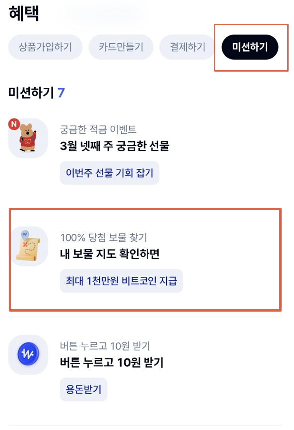 앱 메인 또는 ‘혜택’ 탭에서 ‘미션하기 ➡ 보물찾기 ’ 배너 클릭 → 케이뱅크 보물지도 이벤트 페이지 진입